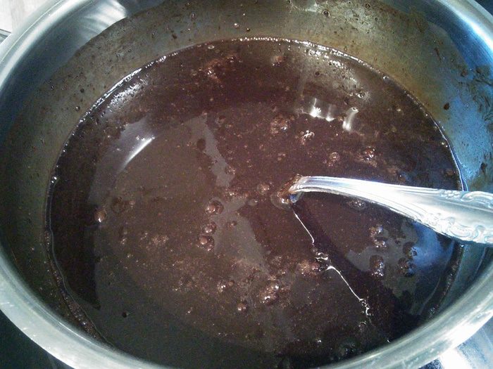 Все сухие ингредиенты сложить в сотейник, размешать, чтобы не было комочков. Влить свежесваренный кофе и воду.