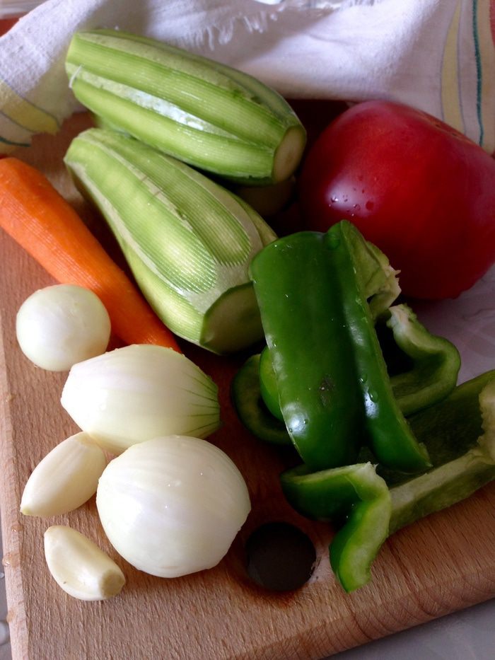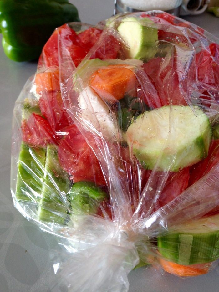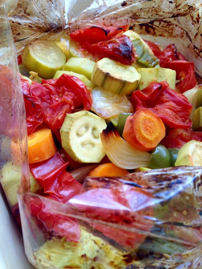 В пакет влить 2 — 3 ст. ложки растительного масла, приправить солью, сахаром и перцем, перемешать овощи руками поверх пакета. Пакет выложить на противень, сделать в пакете несколько проколов зубочисткой и поставить овощи запекаться в разогретую до 180°С духовку на 1 час.