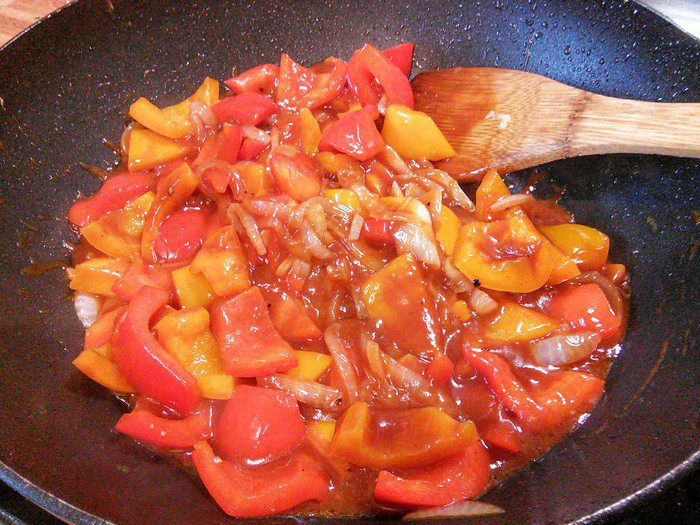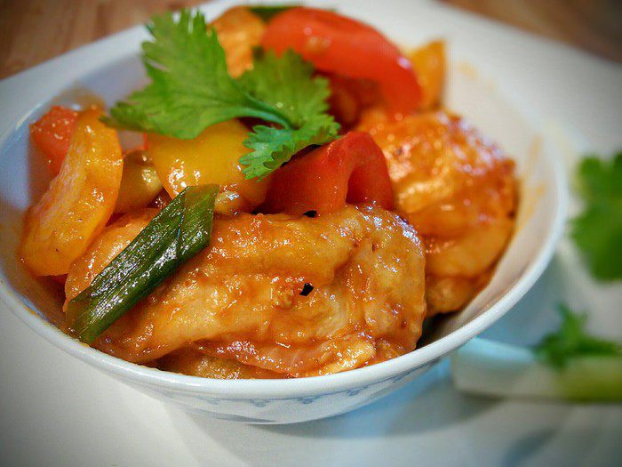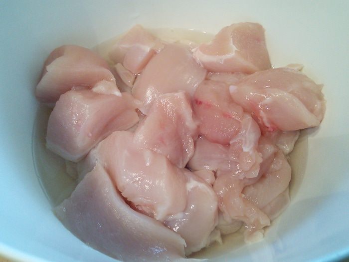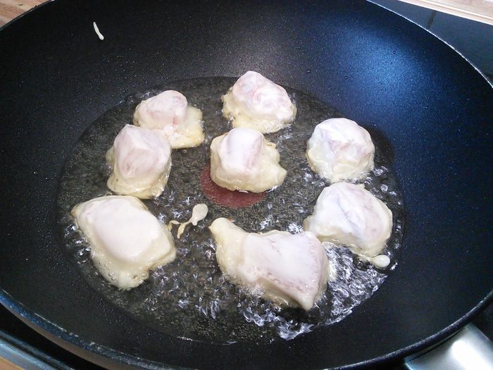 Для начала сделаем тесто, смешав муку, крахмал, разрыхлитель с водой. Размешать, чтобы не было комочков и оставить на 30 мин "набухнуть". Кляр без яиц, на основе крахмала делаю впервые и осталась им очень довольна. Замечательная хрустящая легкая корочка осталась даже после того, как я обваляла кусочки курицы в соусе.