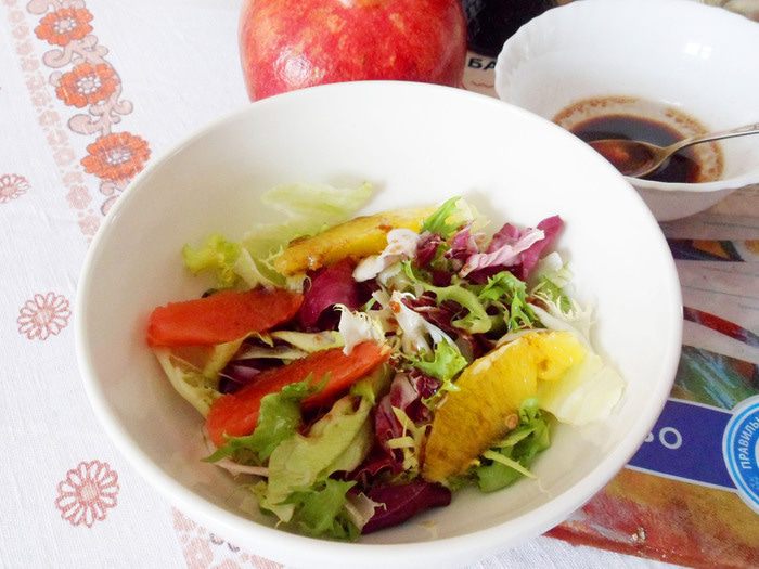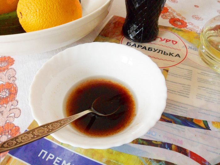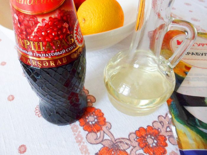Я использовала готовый гранатовый соус наршараб. Гранатовый соус можно приготовить и самим. Выжмите сок из гранатов, перелейте в сотейник, поставьте на средний огонь. Выпаривайте сок до загустения. Должно остаться около 20% от первоначального объема. Остудите и вмешайте оливковое масло.