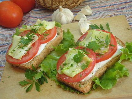 Кусочки хлеба подсушить в тостере (по желанию), намазать сметаной, выложить кусочки помидора, сверху кабачок и присыпать зеленью. Я еще сбрызнула оливковым маслом, настоянным на чесноке и остром перце. Поверьте, очень просто и вкусно!