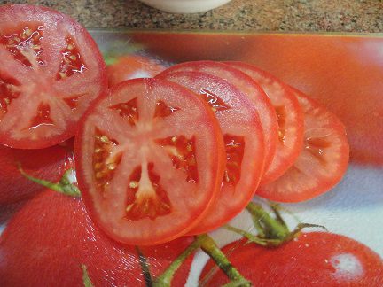 Большой спелый томат нарезать кольцами.