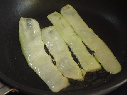 Кабачки нарезать тоненькими пластинками и обжарить на растительном масле до комфортной вам степени прожарки.