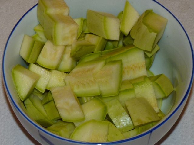 Кабачки нарезать кубиками и отварить до готовности в 800 мл воды.