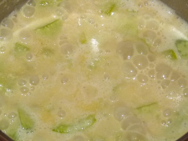 Взбить в блендере кабачки, добавить лук, сливки, соль, перец, горчицу. Взбить все вместе. Довести до кипения.