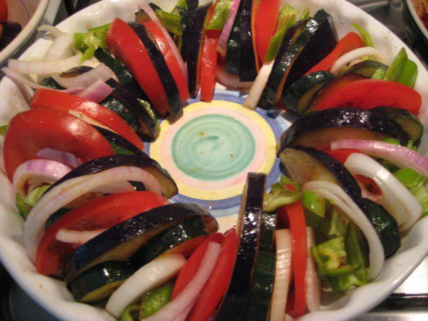 Форму для запекания смазать оливковым маслом, разложить овощи по кругу, чередуя между собой. Смазать оливковым маслом, посолить, поперчить, запечь 20 минут.