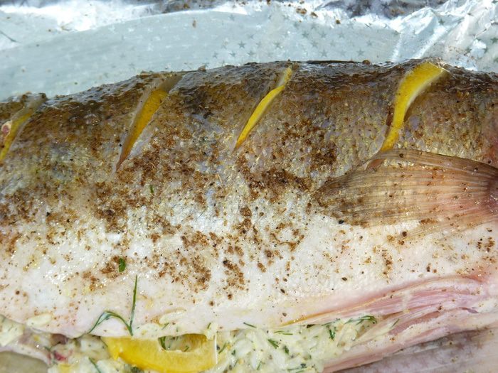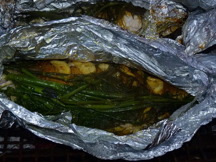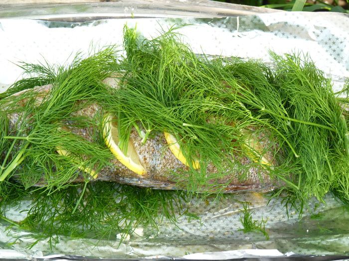 Запекать на решетке 10 минут, затем перевернуть и запекать еще 10 минут. Затем перевернуть через 5 минут, повторить два раза. По истечении 30 минут фольгу развернуть, чтобы лишняя жидкость испарилась. Следует учесть, что судак готовится быстрее, чем другая рыба. Стоит учесть также количество жара, у нас средний. Если готовить в духовке, то время запекания 20-25 минут, затем развернуть и 5 минут подрумянить.