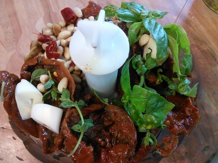 Приготовить песто быстро и легко. Необходимо несколько ингридиентов, но должны они быть хорошего качества. Прежде всего это касается оливкового масла, а если у вас есть вяленые томаты собственного изготовления, то песто отличного качества у вас в «кармане».