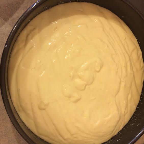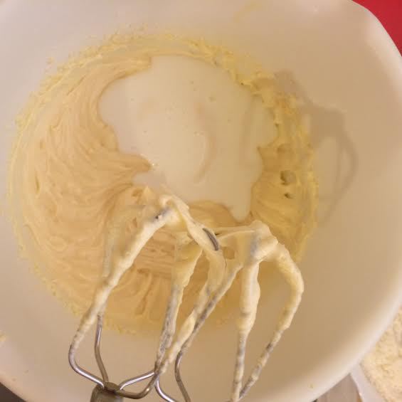 Добавить муку в три приема в яичную смесь, чередую с кефиром.