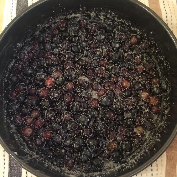 Духовку нагреть до 170°С. Форму 20 (см) хорошо смазать маслом. Чернику смешать с сахаром и выложить в форму.
