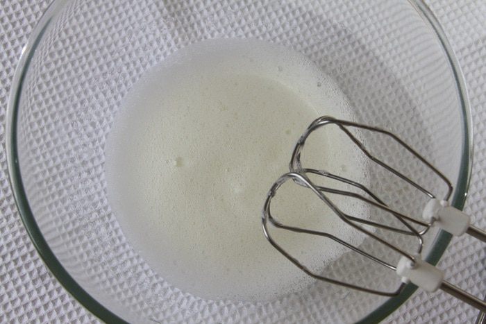 Яичные белки взбить в пену, но чтобы они оставались жидкими.