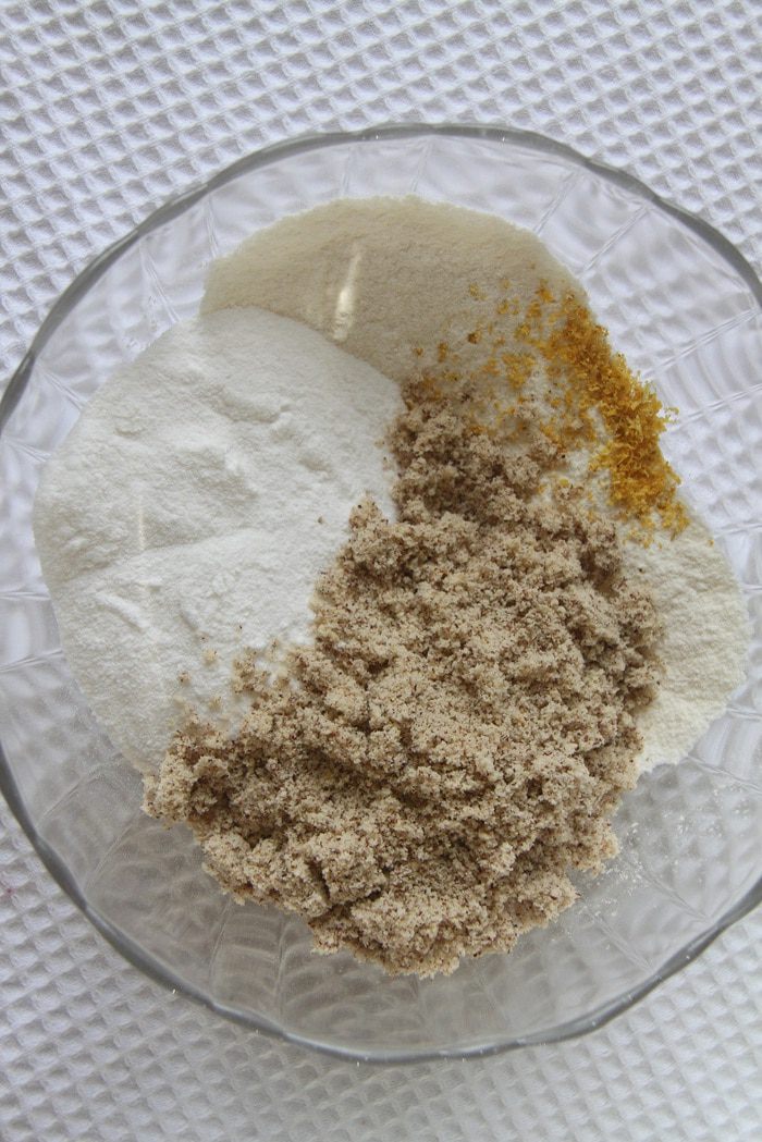 Соединить просеянную муку, сахарную пудру, ореховую муку и лимонную цедру.