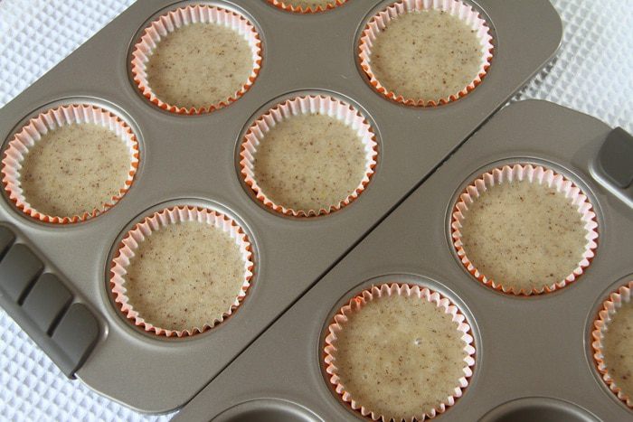 Разлить тесто в формочки для маффинов (мне нравится с бумажными вкладышами), не доливая до края на 1 см.