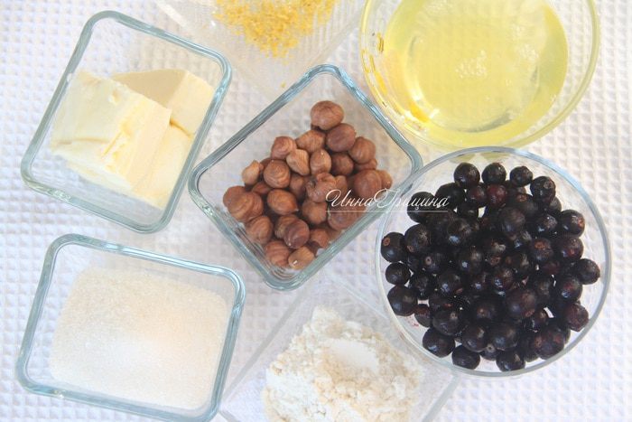 Понадобятся: 3 яичных белка, 108 г сливочного масла, 108 г сахарной пудры, 30 г муки в/с, цедра половинки лимона, 60 г фундука (или фундучной муки), 90 г черной смородины.