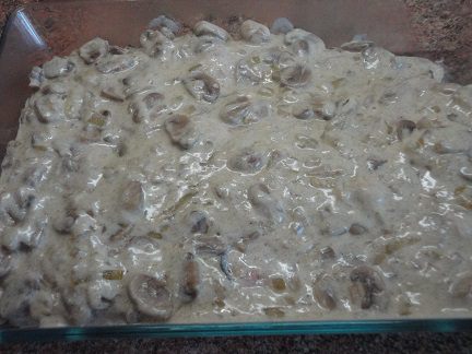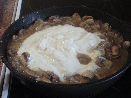 Грибы и лук нарезать достаточно мелко. Правда, у меня были мелкие шампиньоны и я их просто пластинками нарезала. В сковороде разогреть сливочное и растительное масло. Обжарить лук до прозрачности, добавить грибы и тушить не менее 5 минут. Добавить муку, перемешать. Затем добавить сметану. Посолить, поперчить по вкусу.