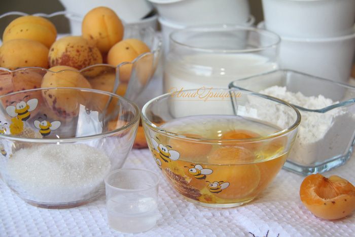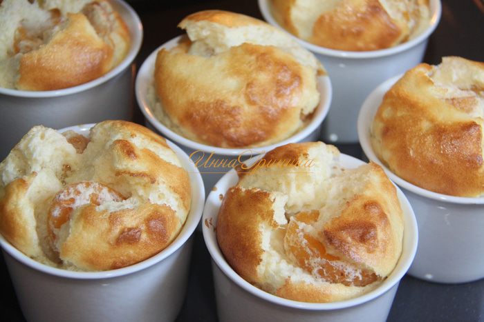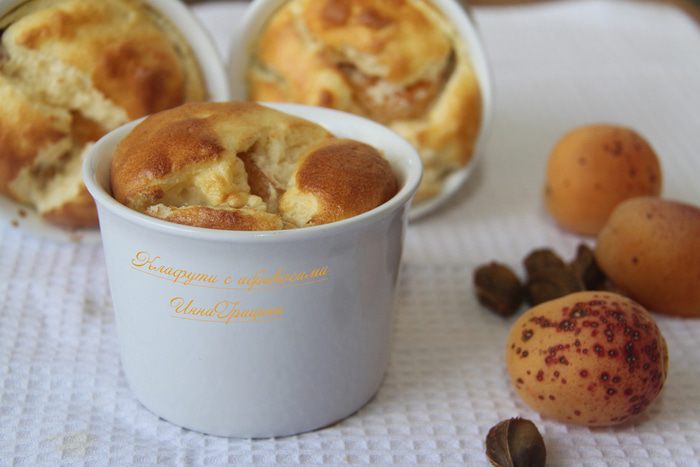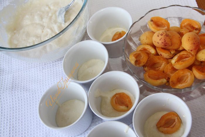 Формочки для выпечки смазать сливочным маслом (всего 0,5-1 ст.л.). Выложить на дно каждой формочки 1-2 ст.л. теста, затем 2-3 половинки абрикоса, затем снова тесто, повторить.