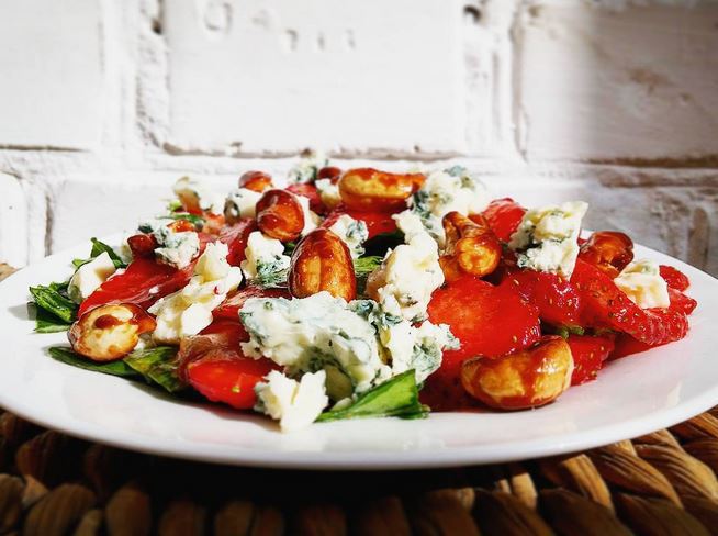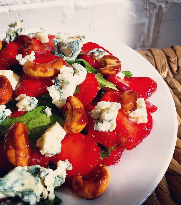 Смешать все ингредиенты для соуса, заправить этой смесью клубнику и шпинат. Сверху выложить раскрошенный сыр (у меня — Bleu d'Auvergne) и обжаренные орехи кешью.