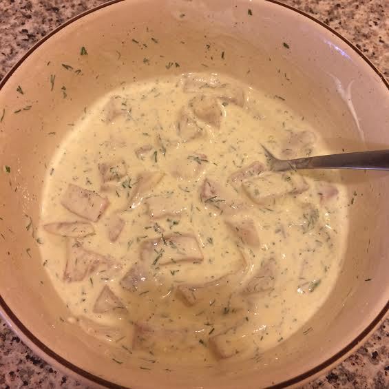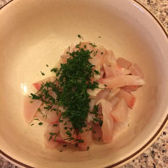 Филе рыбы нарезать, добавить укроп и сок одного лимона.