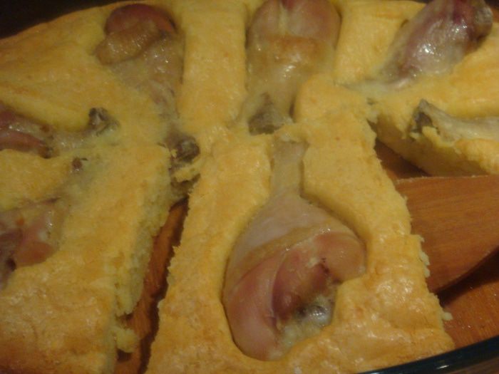 Форму смазать растительным маслом, выложить голени и аккуратно вылить тесто. Выпекаем в предварительно разогретой духовке 200°С 20-30 минут до золотистой корочки пирога.