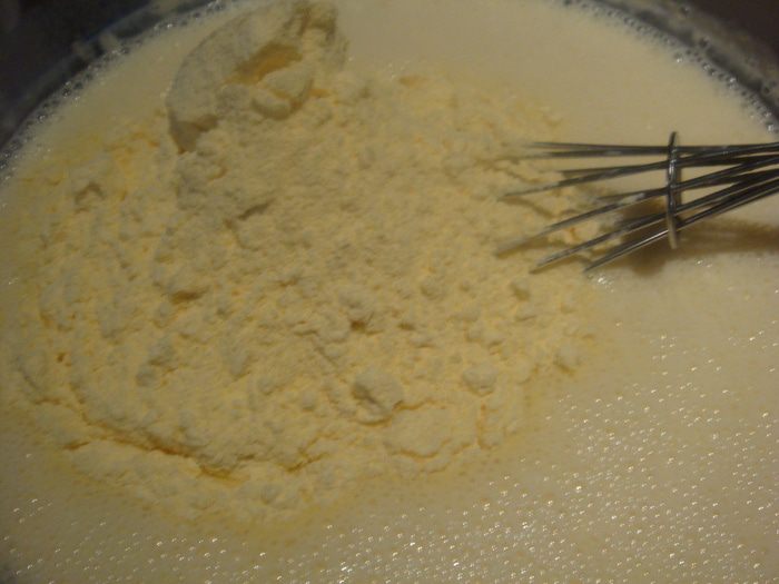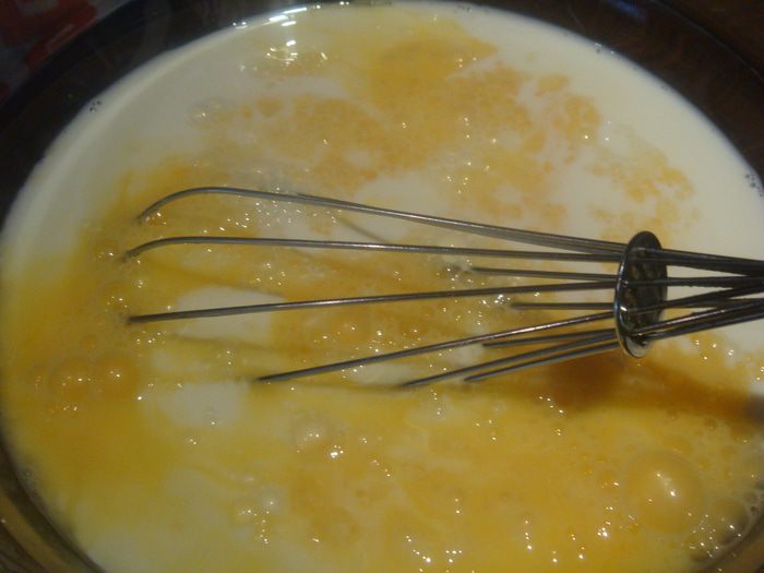 Яйца и молоко взбить немного венчиком.