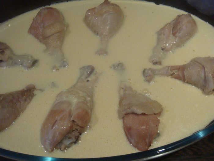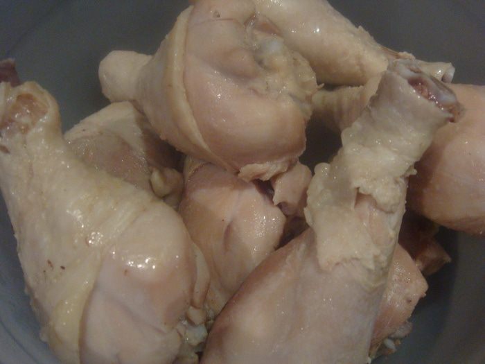 Предварительно отварить куриные голени. Остудить.