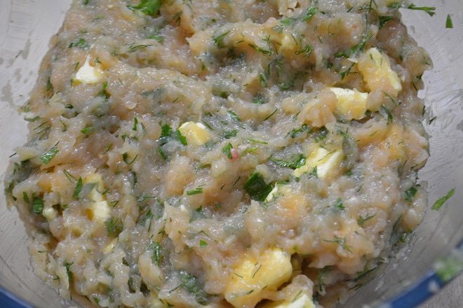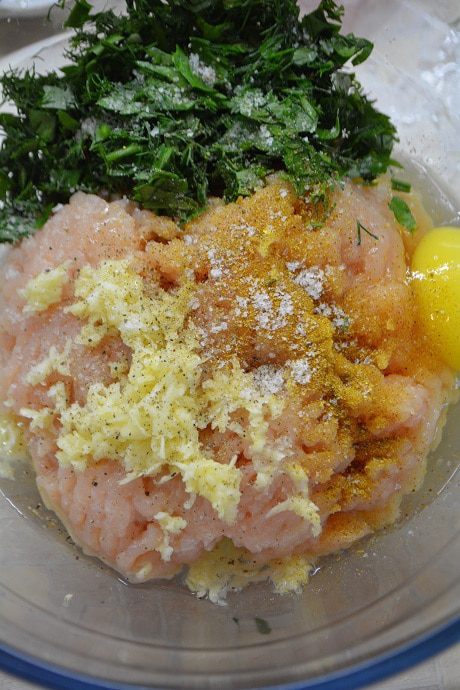 В миске смешать фарш, измельченную зелень, чеснок через пресс, яйцо, приправу для курицы, соль и перец. Все хорошо вымесить.