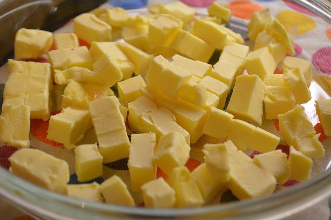Сливочное масло нарезать мелкими кубиками 0,5х0,5 см. Убрать в морозилку на 10 минут.