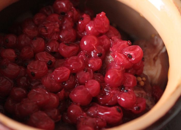 Смешать мясо с заправкой и выложить в горшочек. Сверху равномерно распределить красную смородину с сахаром накрыть горшочки крышкой и отправить в разогретую до 180°С духовку примерно на час.