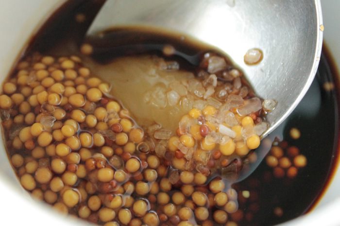 Приготовить заправку: смешать соевый соус, горчицу, натертый на мелкой терке корень имбиря, мед. Красную смородину засыпать сахаром и дать постоять 5 мин.