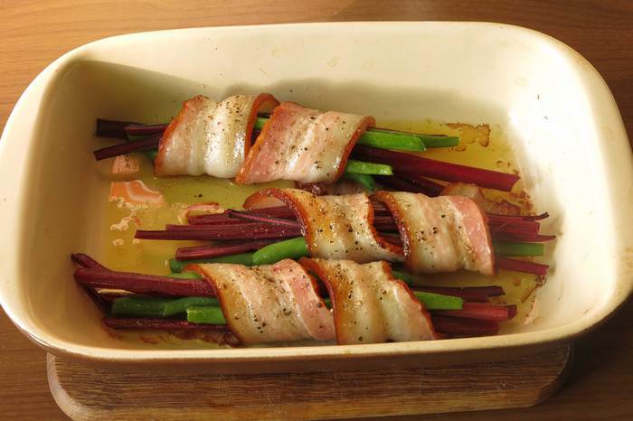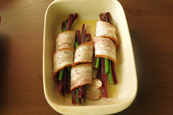 Дачный ужин — наконец-то наступает прохлада, (градусов так, 25-27) и особая вечерняя атмосфера дачи, можно приготовить что-нибудь на гриле или в печи, днем о таком и не подумаешь, жарковато, только приготовить надо быстро, до сумерек, пока, видно, что лежит в тарелке. И продукты самые дачные, огородные — спаржевая фасоль и чершки мангольда (или молодая ботва свеклы столовой), все это заворачивается в бекон, обжаривается. Блюдо придумала по мотивам «спаржи в беконе», эта культура на даче не прижилась, поэтому используем бюджетную замену. Приготовив закуску, прочитала на сайте, в статье о мангольд, что этот овощ готовят как спаржу, так что со способом обработки угадала. Такая начинка бекона полезная, витаминная и яркая. Приятного аппетита!