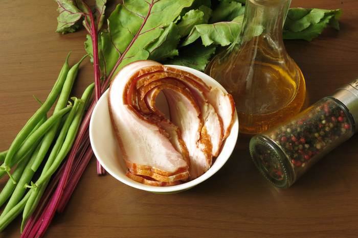 Черешки, фасоль, бекон, немного масла и перец.