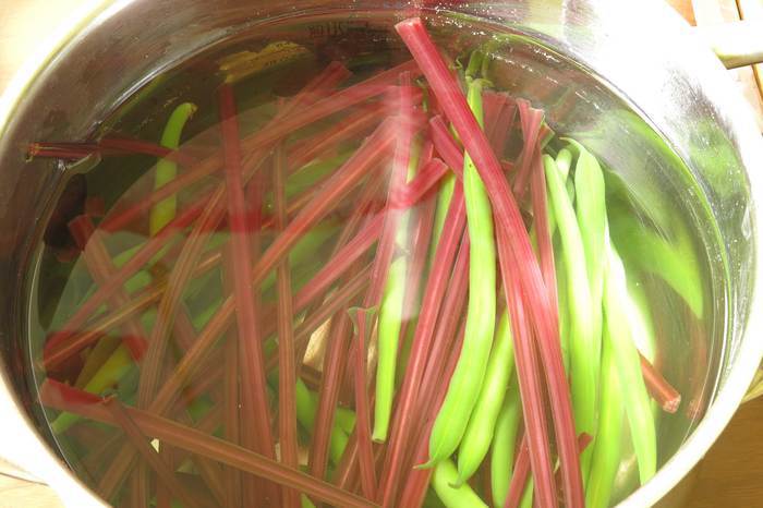 Отрезаем черешки — вес в ингредиентах указан чистый. Отвариваем в кипящей воде вместе с фасолью 10 минут. Кладем овощи в холодную воду для сохранения цвета. Достаем, просушиваем. Срезаем кончики с фасоли.