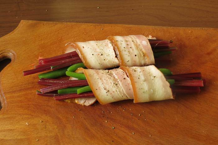 Делим черешки и стручки на 6 пучков и заворачиваем в полоски бекона.