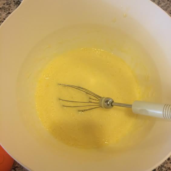 Слегка взбить кефир и яйцо. Добавить растопленное сливочное масло, перемешать.