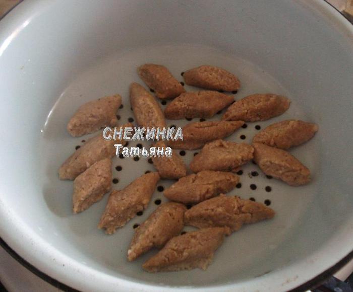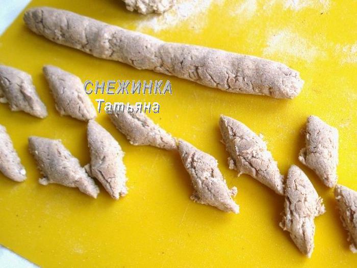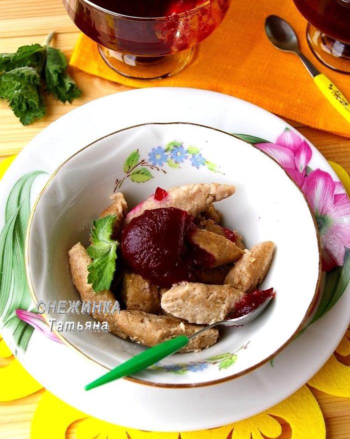 Склеивающую функцию отчасти выполняет льняная мука, сладость придает банан, лишнюю влагу на себя берут овсяные хлопья, гречневая мука выступает окончательным элементом и для раскатки. Готовлю обычно их на пару, так они не впитывают много воды и сохраняют вид, но можно и отварить, они прекрасно держат форму. Кушаю обычно их с простоквашей или ряженкой, даже без сладкого дополнения.