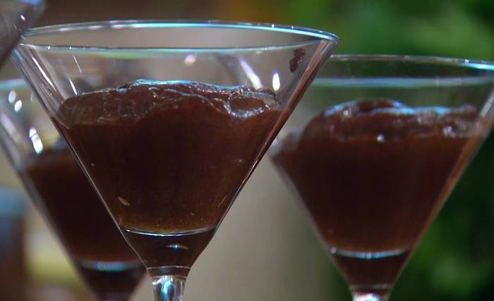 Шоколадный мусс разложить в бокалы для мартини и отправить в холодильник.