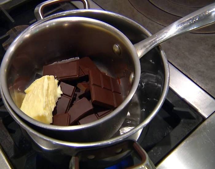 Шоколад поломать небольшими кусочками, выложить в кастрюлю, добавить предварительно размягченное сливочное масло и растопить все на водяной бане.