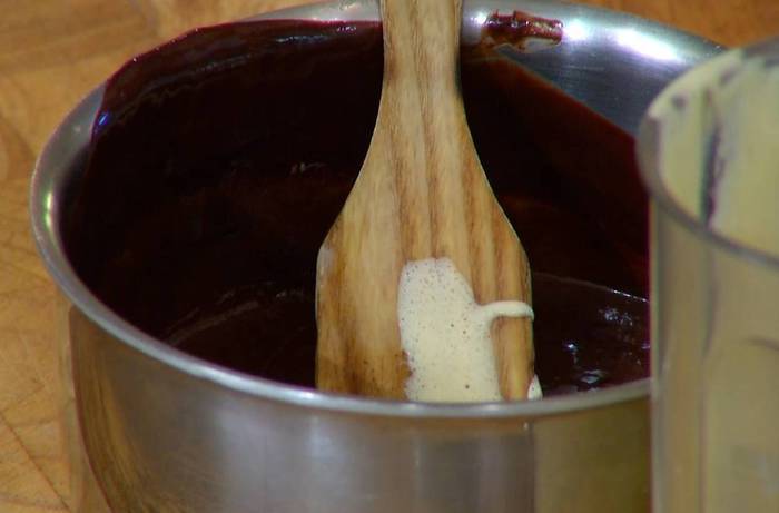 В растопленный шоколад с маслом влить взбитые желтки и вымешать все деревянной лопаткой.