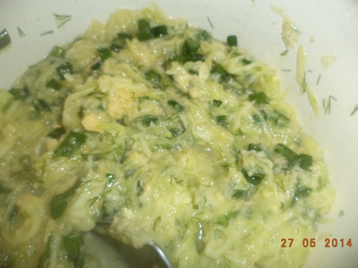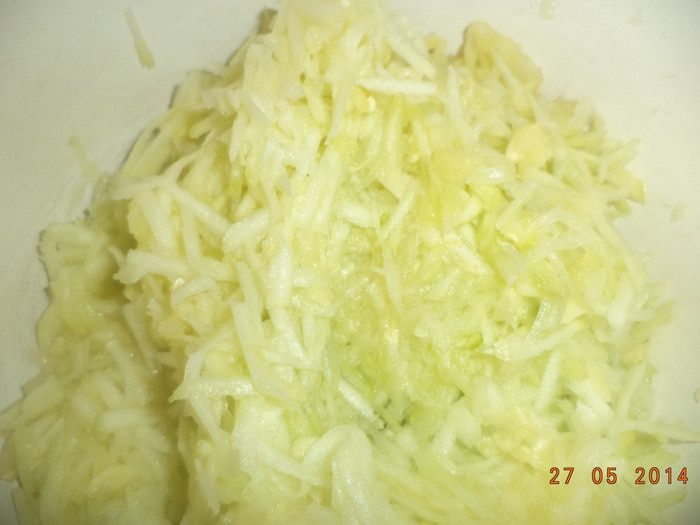 Кабачки очистить, натереть на крупной терке.