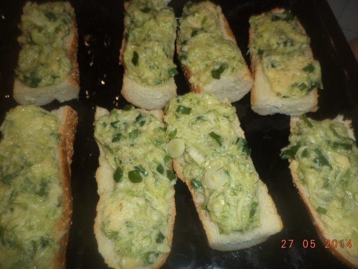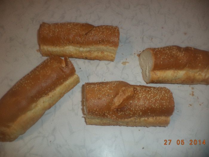 Багет разрезать поперек на 4 части, затем каждую часть разрезать вдоль пополам.