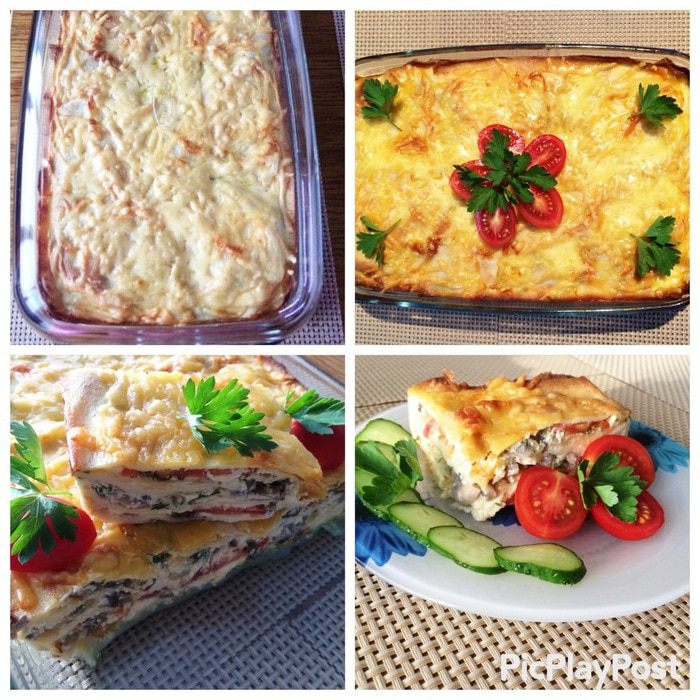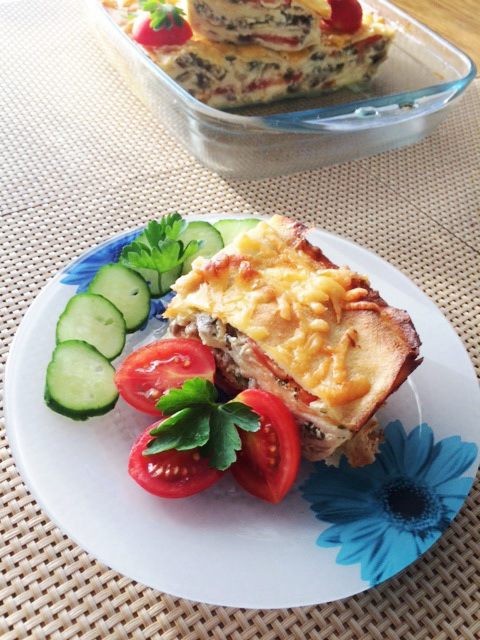 Моем, чистим грибы, нарезаем произвольно и отправляем обжариваться к луку. Солим, перчим по вкусу. Как выпариться жидкость, грибы готовы, остужаем.