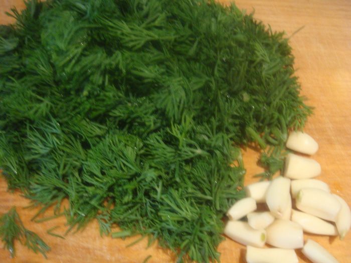 Укроп помыть, мелко нарезать. Начистить чеснок.