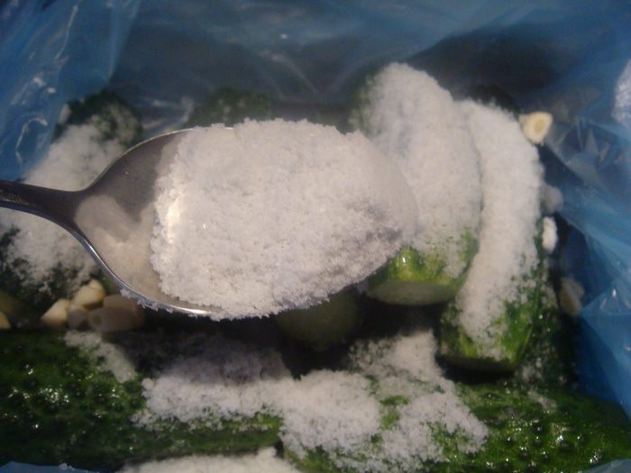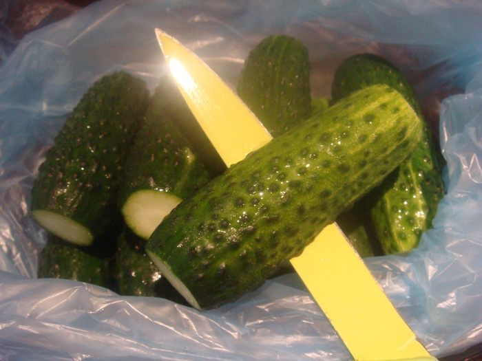 Огурцы помыть, срезать концы и проколоть ножом по середине. Сложить огурцы в полиэтиленовый пакет.