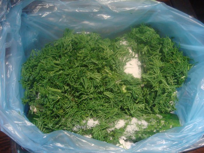 Добавить укроп и чеснок. Пакет завязать (для герметичности я положила в два пакета и подставляла тарелку), хорошо стряхнуть и поставить в холодильник.