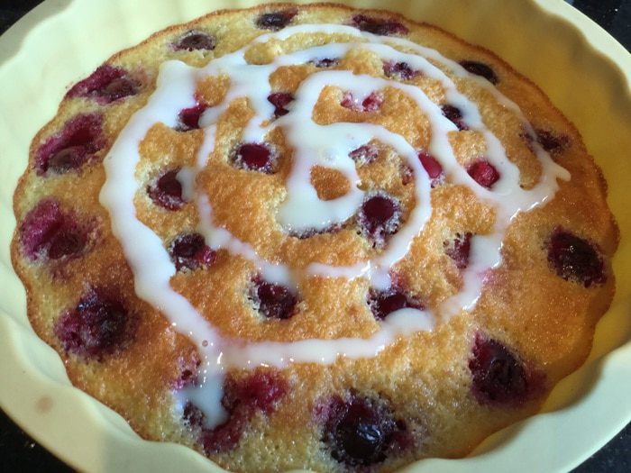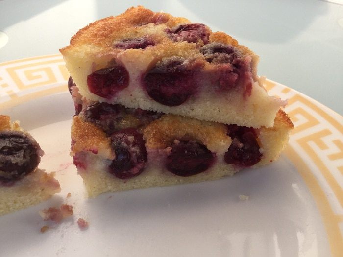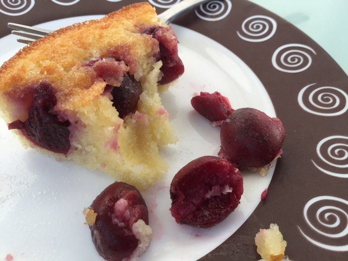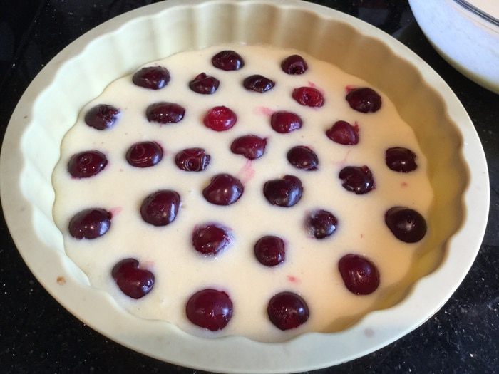 Вдавите вишенки наполовину в тесто. Выпекайте в духовке 20-25 минут, пока не подрумянится.