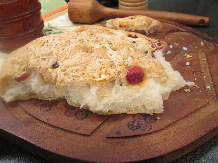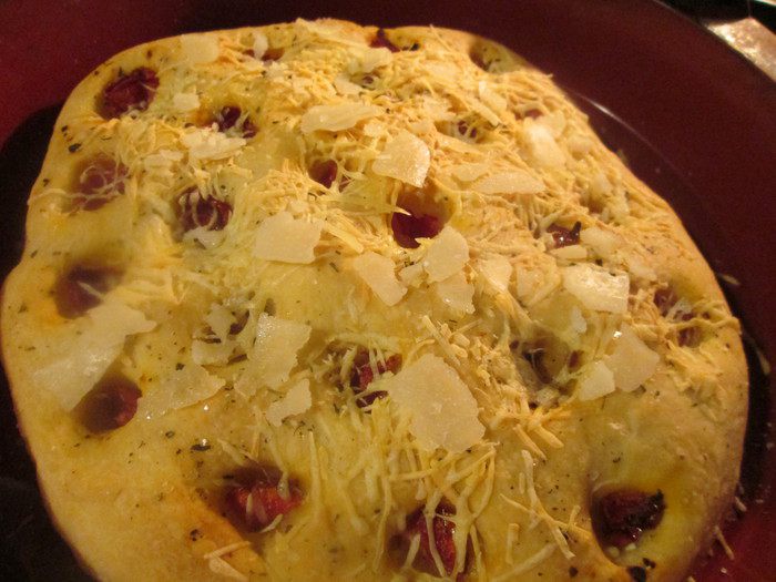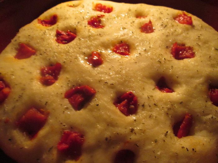 Тем временем разогреваем духовку вместе с камнем для выпечки или противнем до 230°С. Делаем на поверхности фокаччи углубления, сбрызгиваем поверхность оливковым маслом, укладываем в углубления кусочки вяленых томатов и посыпаем прованскими травами вместе с крупной солью. Сверху посыпаем швейцарским сыром.