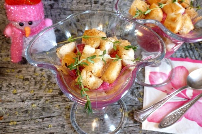 Теперь в вазочку кладем ложку свекольного крема, затем несколько крутонов, снова свекольный крем и так? пока не заполним вазочку. Украсим веточкой тимьяна.