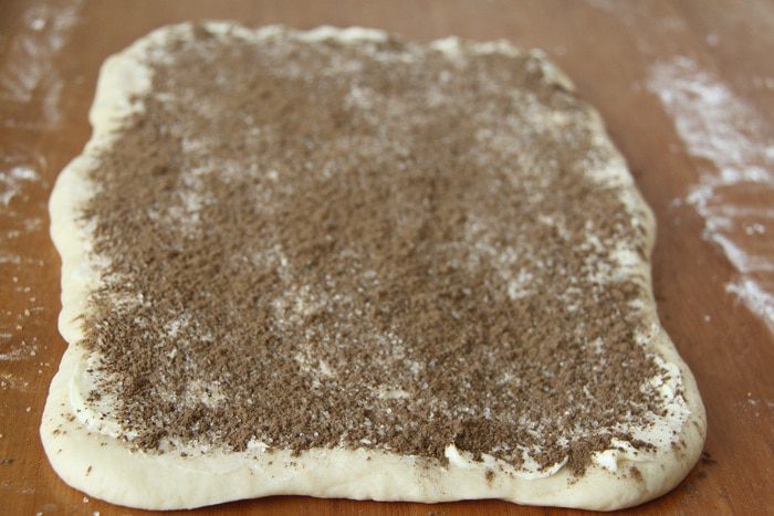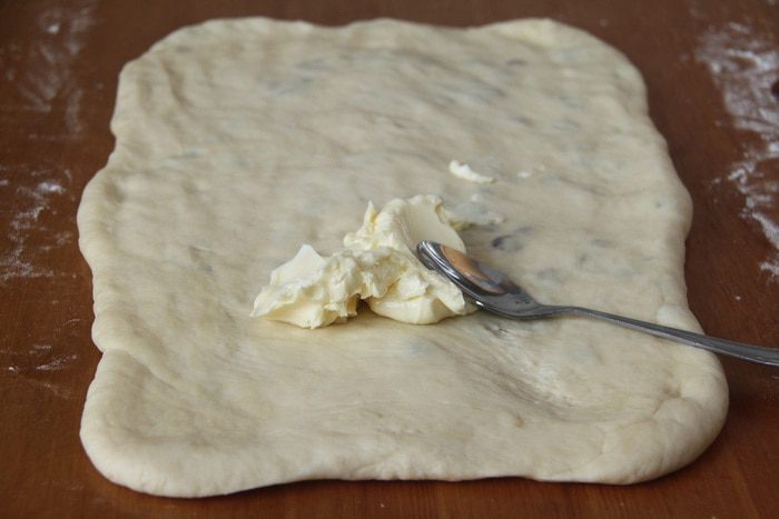 Раскатать тесто в длину еще раз. Изюм окажется между слоями теста. Смазать поверхность теста 2 ст. л. сливочного масла.