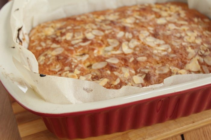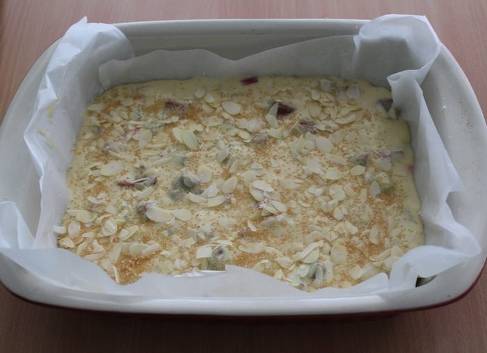 Переложить тесто в застеленную бумагой форму и разровнять. Присыпать сверху миндальными лепестками и коричневым сахаром.