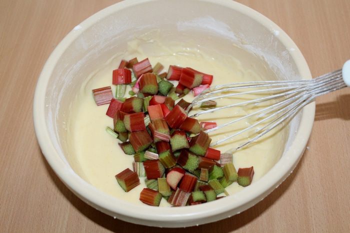 Добавить порезанный ревень, аккуратно перемешать.